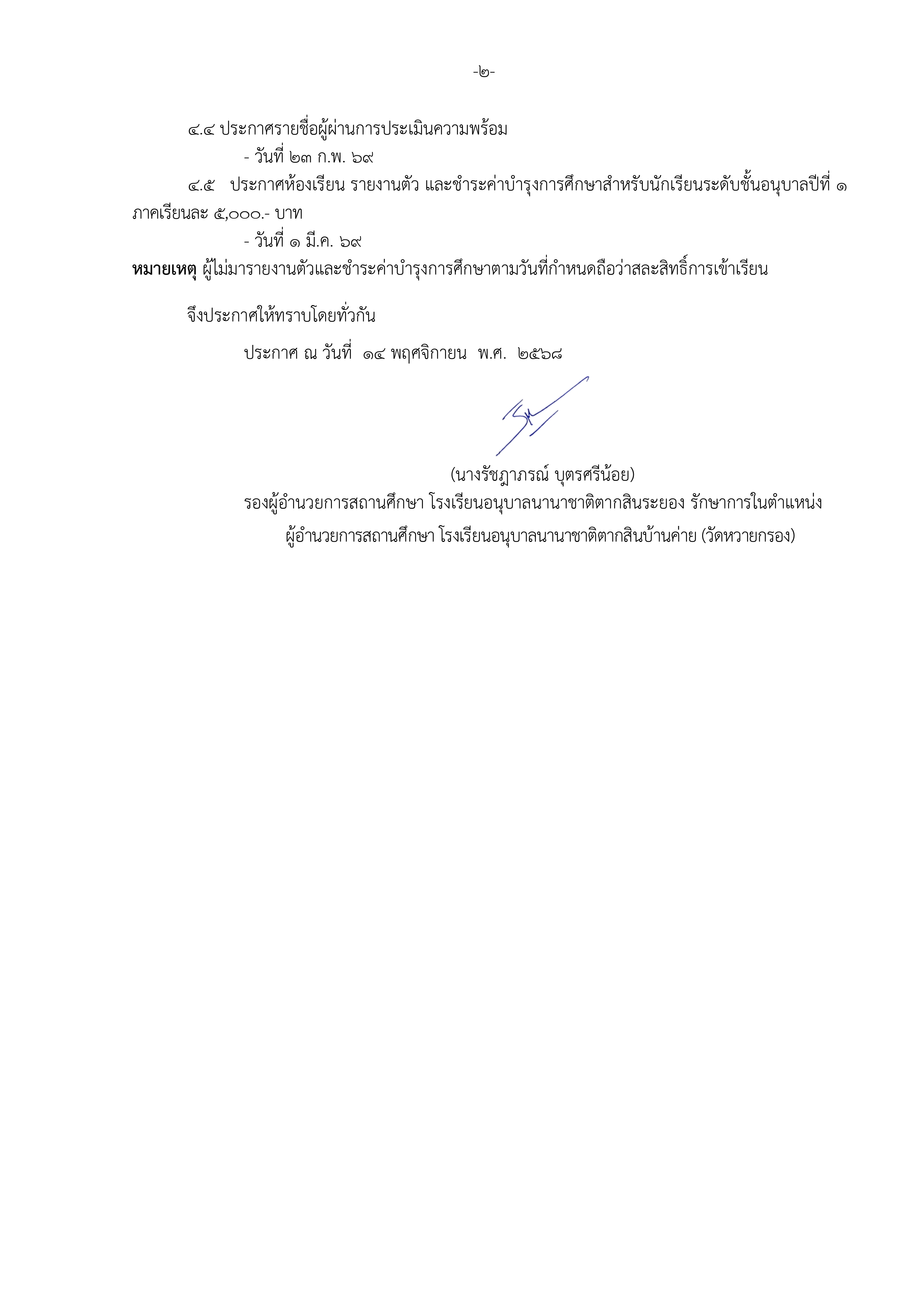 – ระดับชั้นอนุบาลปีที่ 2 รับนักเรียนอายุครบ 4 ปีบริบูรณ์ นับถึงวันเปิดภาคเรียน (วันที่ 16 พ.ค. 69) คือนักเรียนที่เกิดระหว่างวันที่ 17 พ.ค. 64 – 16 พ.ค. 65