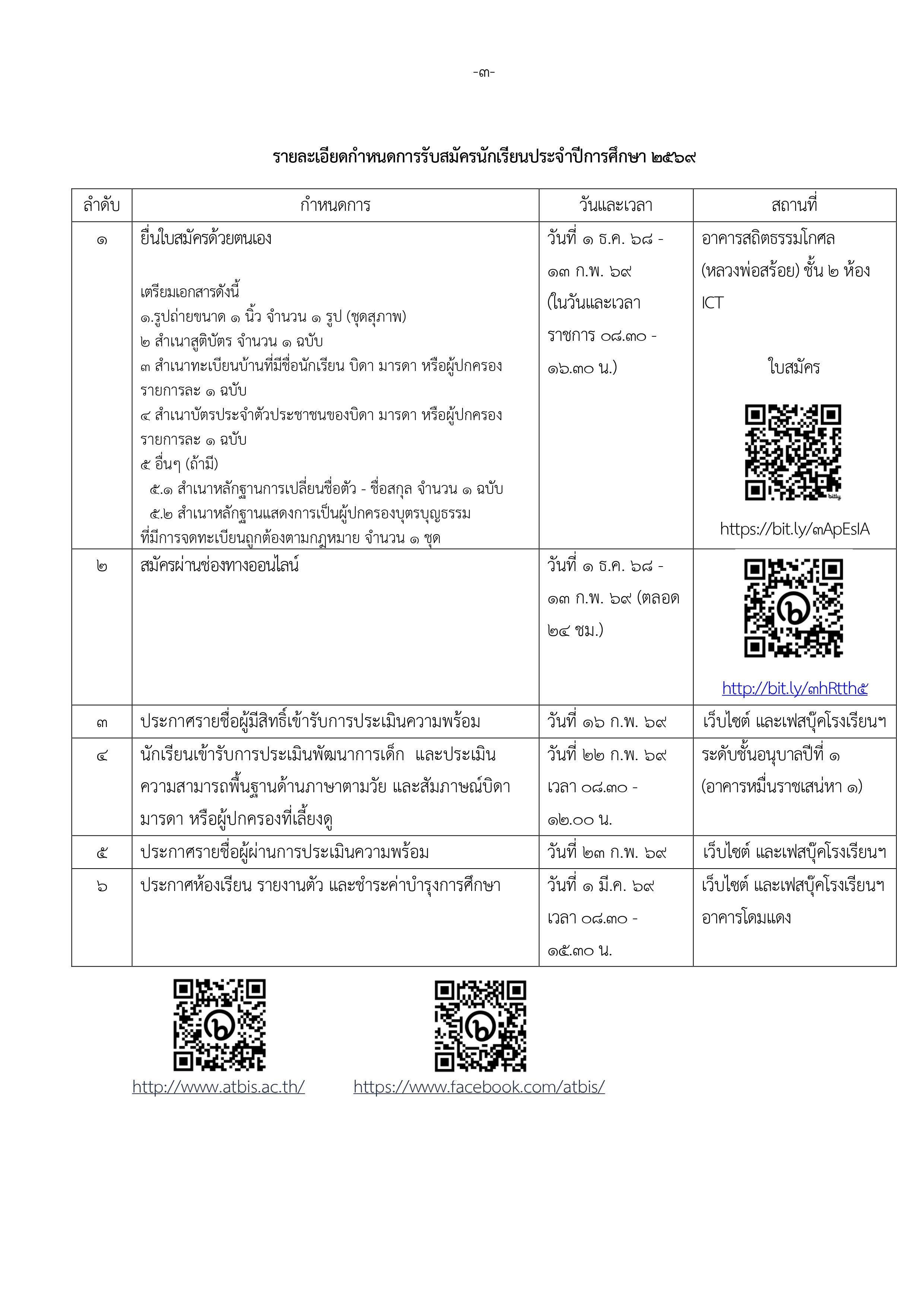 – ระดับชั้นอนุบาลปีที่ 3 รับบนักเรียนอายุครบ 5 ปีบริบูรณ์ นับถึงวันเปิดภาคเรียน (วันที่ 16 พ.ค. 69) คือนักเรียนที่เกิดระหว่างวันที่ 17 พ.ค. 63 – 16 พ.ค. 64
