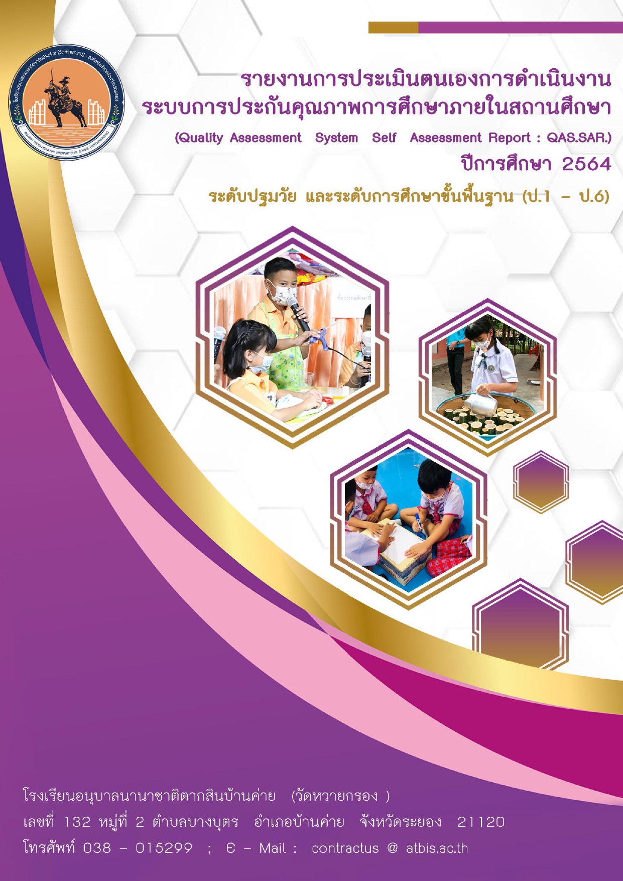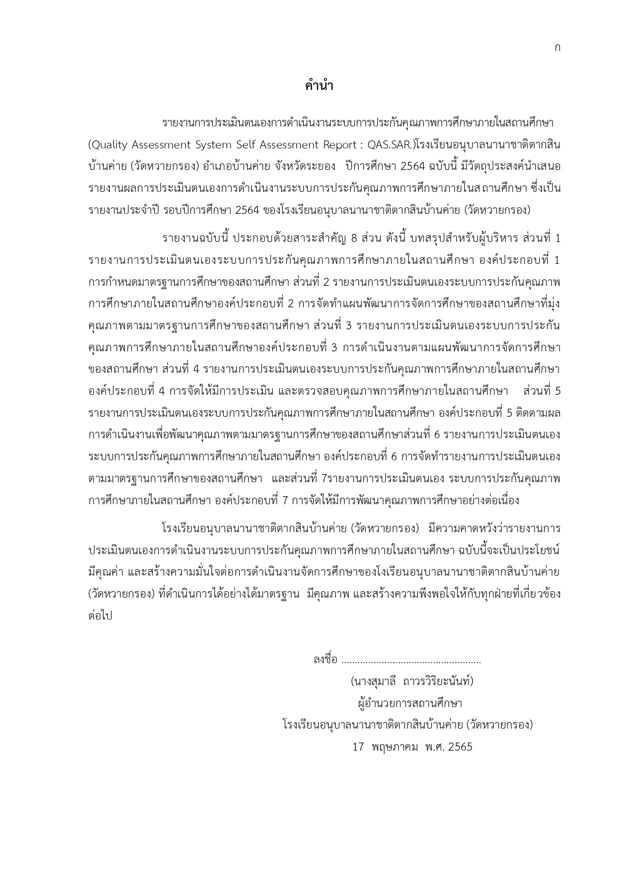 รายงานการประเมินตนเองการดำเนินงานระบบการประกันคุณภาพการศึกษาภายในสถานศึกษา(Quality Assessment System Self Assessment Report : QAS.SAR.)โรงเรียนอนุบาลนานาชาติตากสินบ้านค่าย (วัดหวายกรอง) อำเภอบ้านค่าย จังหวัดระยอง ปีการศึกษา 2564 ฉบับนี้ มีวัตถุประสงค์นำเสนอรายงานผลการประเมินตนเองการดำเนินงานระบบการประกันคุณภาพการศึกษาภายในสถานศึกษา ซึ่งเป็นรายงานประจำปี รอบปีการศึกษา 2564 ของโรงเรียนอนุบาลนานาชาติตากสินบ้านค่าย (วัดหวายกรอง)