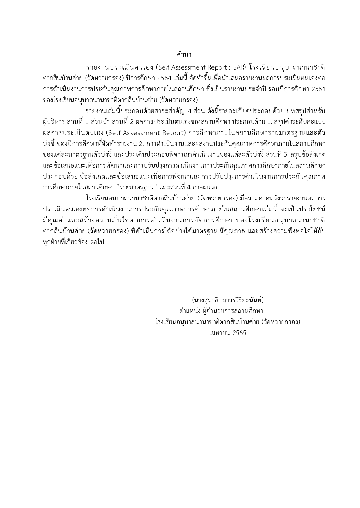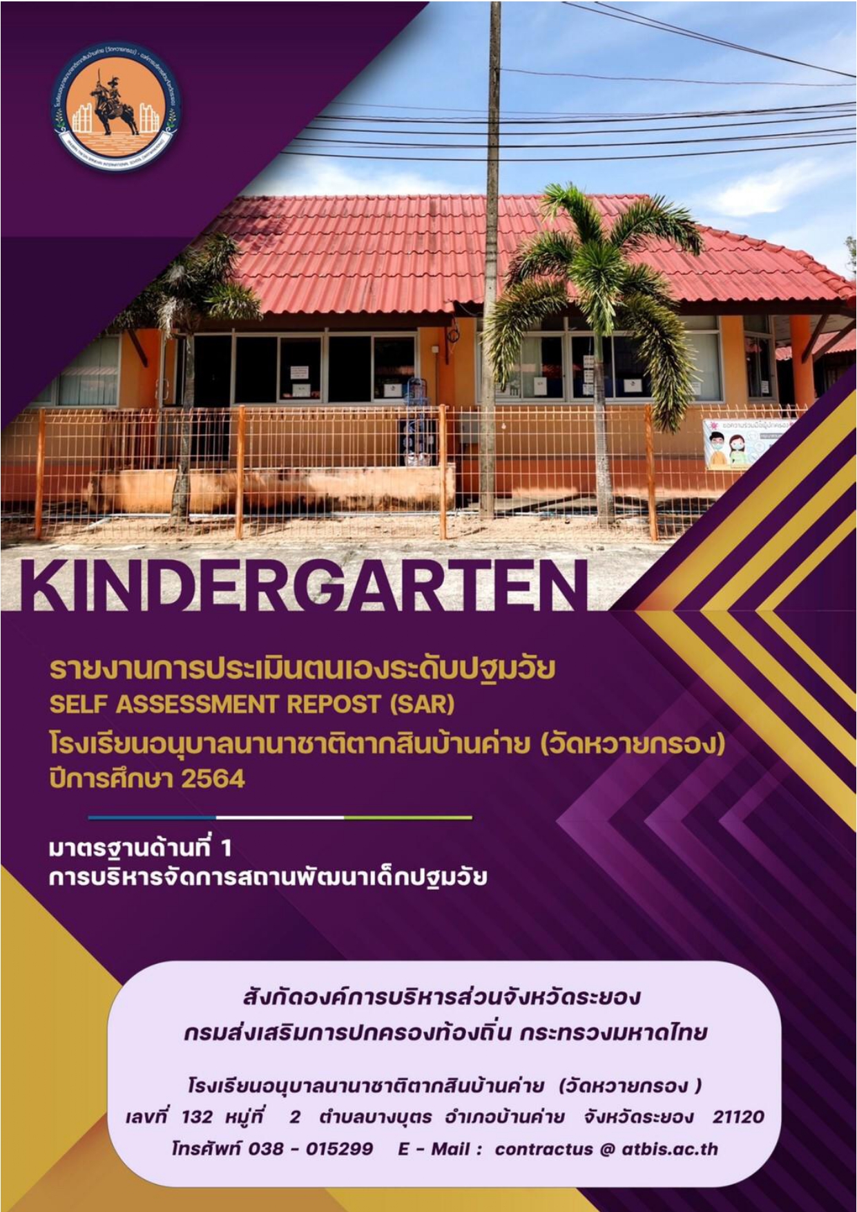 รายงานประเมินตนเอง (Self AssessmentReport : SAR) โรงเรียนอนุบาลนานาชาติตากสินบ้านค่าย (วัดหวายกรอง) ปีการศึกษา 2564 เล่มนี้ จัดทำขึ้นเพื่อนำเสนอรายงานผลการประเมินตนเองต่อ