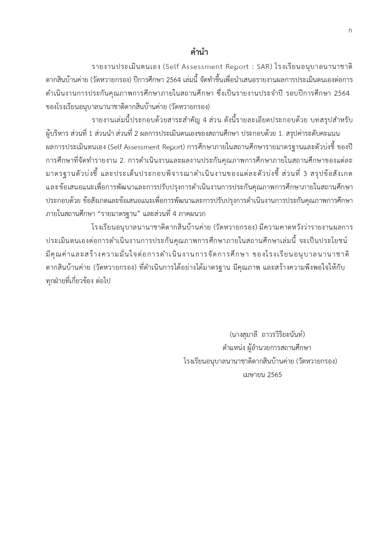การดำเนินงานการประกันคุณภาพการศึกษาภายในสถานศึกษา ซึ่งเป็นรายงานประจำปีรอบปีการศึกษา 2564 ของโรงเรียนอนุบาลนานาชาติตากสินบ้านค่าย (วัดหวายกรอง)
