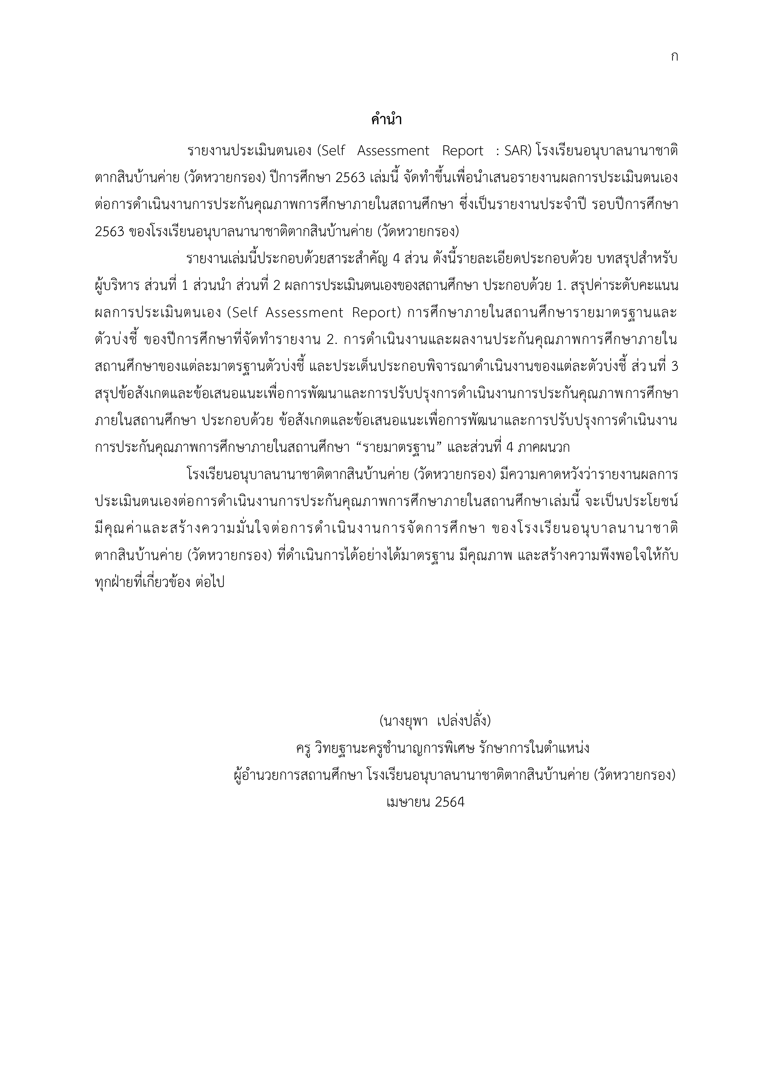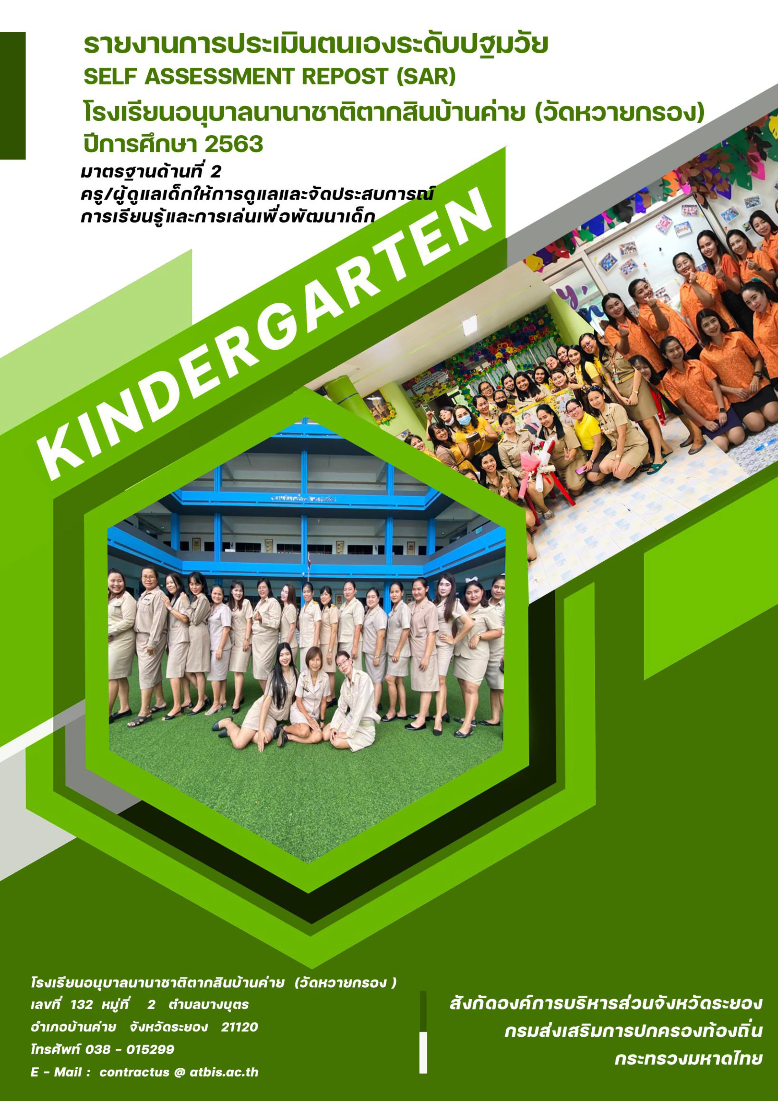 รายงานประเมินตนเอง (Self Assessment Report : SAR) โรงเรียนอนุบาลนานาชาติ ตากสินบ้านค่าย (วัดหวายกรอง) ปีการศึกษา 2563 เล่มนี้ จัดทำขึ้นเพื่อนำเสนอรายงานผลการประเมินตนเองต่อการดำเนินงานการประกันคุณภาพการศึกษาภายในสถานศึกษา ซึ่งเป็นรายงานประจำปี รอบปีการศึกษา 2563 ของโรงเรียนอนุบาลนานาชาติตากสินบ้านค่าย (วัดหวายกรอง) รายงานเล่มนี้ประกอบด้วยสาระสำคัญ 4 ส่วน ดังนี้รายละเอียดประกอบด้วย บทสรุปสำหรับผู้บริหาร ส่วนที่ 1 ส่วนนำ ส่วนที่ 2 ผลการประเมินตนเองของสถานศึกษา ประกอบด้วย 1. สรุปค่าระดับคะแนนผลการประเมินตนเอง (Self Assessment Report) การศึกษาภายในสถานศึกษารายมาตรฐานและตัวบ่งชี้ ของปีการศึกษาที่จัดทำรายงาน 2. การดำเนินงานและผลงานประกันคุณภาพการศึกษาภายในสถานศึกษาของแต่ละมาตรฐานตัวบ่งชี้ และประเด็นประกอบพิจารณาดำเนินงานของแต่ละตัวบ่งชี้ ส่วนที่ 3 สรุปข้อสังเกตและข้อเสนอแนะเพื่อการพัฒนาและการปรับปรุงการดำเนินงานการประกันคุณภาพการศึกษาภายในสถานศึกษา ประกอบด้วย ข้อสังเกตและข้อเสนอแนะเพื่อการพัฒนาและการปรับปรุงการดำเนินงานการประกันคุณภาพการศึกษาภายในสถานศึกษา “รายมาตรฐาน” และส่วนที่ 4 ภาคผนวก