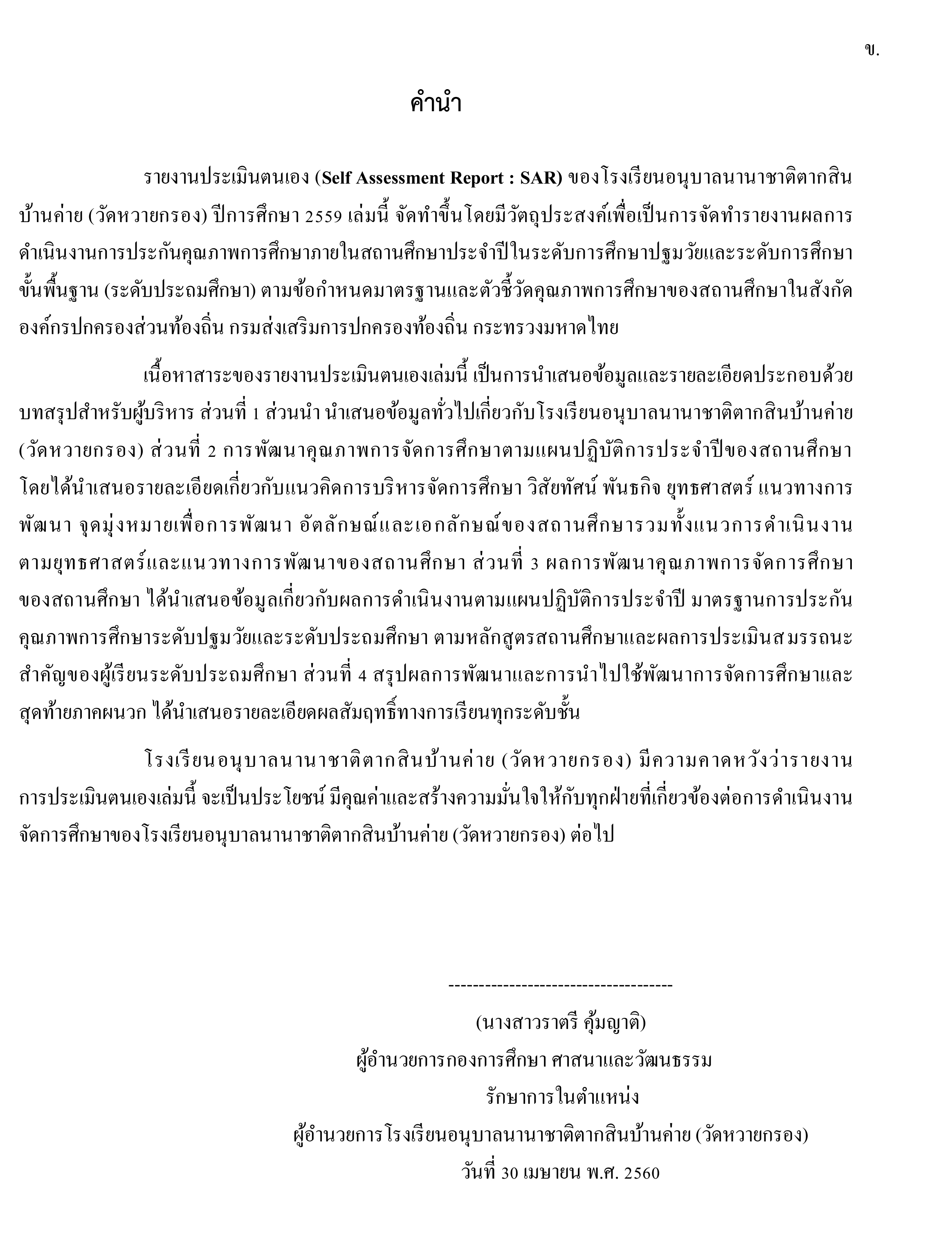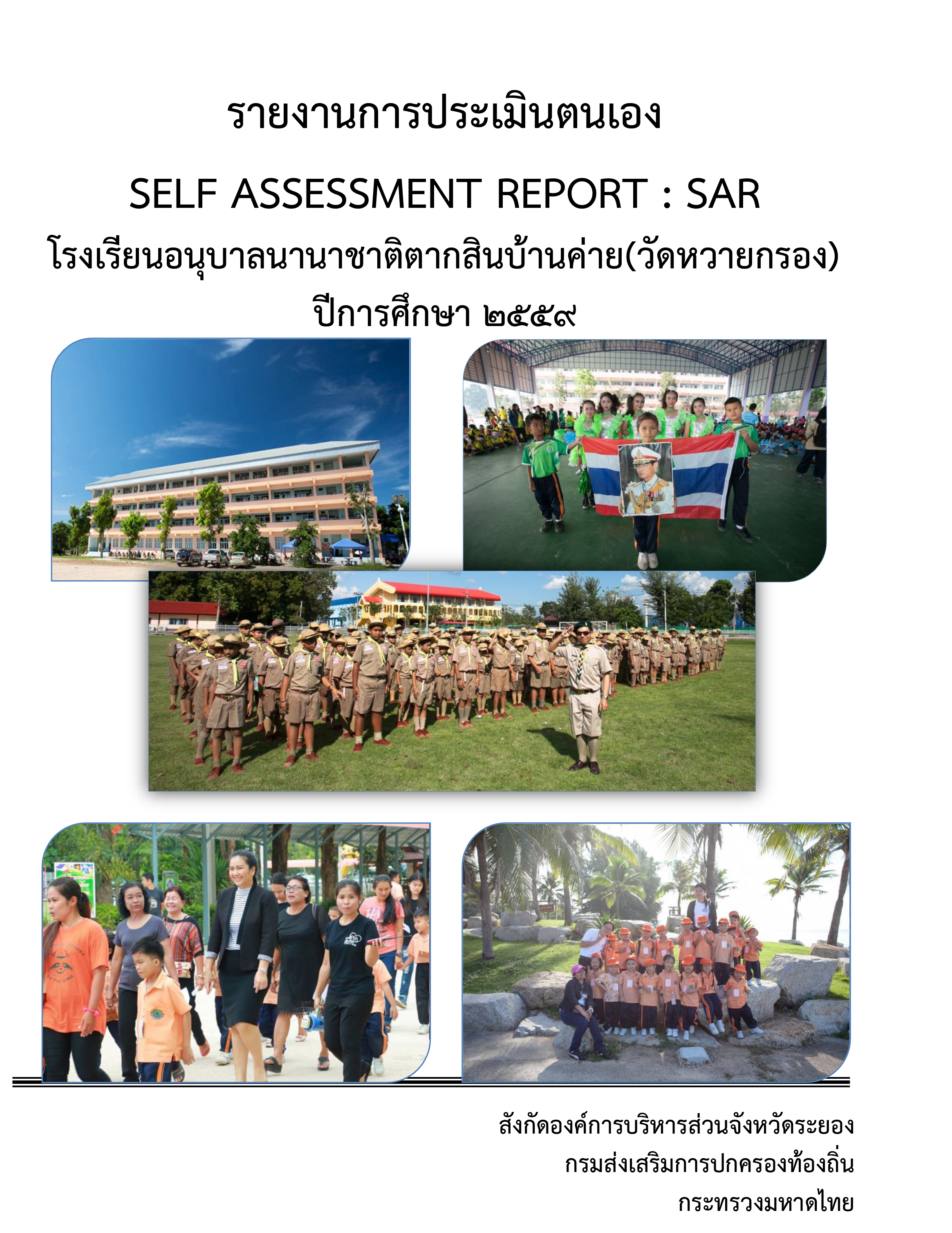 รายงานประเมินตนเอง (Self Assessment Report : SAR) ของโรงเรียนอนุบาลนานาชาติตากสินบ้านค่าย (วัดหวายกรอง) ปีการศึกษา 2559 เล่มนี้ จัดทำขึ้นโดยมีวัตถุประสงค์เพื่อเป็นการจัดทำรายงานผลการดำเนินงานการประกันคุณภาพการศึกษาภายในสถานศึกษาประจำปีในระดับการศึกษาปฐมวัยและระดับการศึกษาขั้นพื้นฐาน (ระดับประถมศึกษา) ตามข้อกำหนดมาตรฐานและตัวชี้วัดคุณภาพการศึกษาของสถานศึกษาในสังกัดองค์กรปกครองส่วนท้องถิ่น กรมส่งเสริมการปกครองท้องถิ่น กระทรวงมหาดไทย