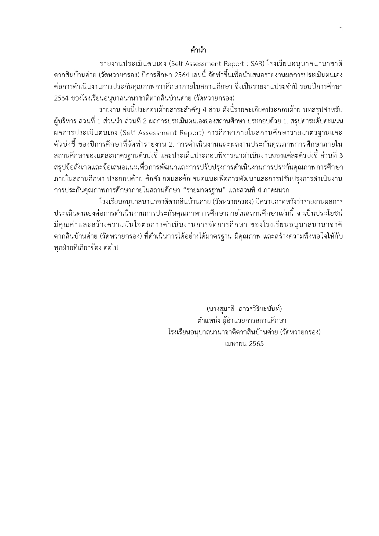 รายงานประเมินตนเอง (Self AssessmentReport : SAR) โรงเรียนอนุบาลนานาชาติตากสินบ้านค่าย (วัดหวายกรอง) ปีการศึกษา 2564 เล่มนี้ จัดทำขึ้นเพื่อนำเสนอรายงานผลการประเมินตนเองต่อ