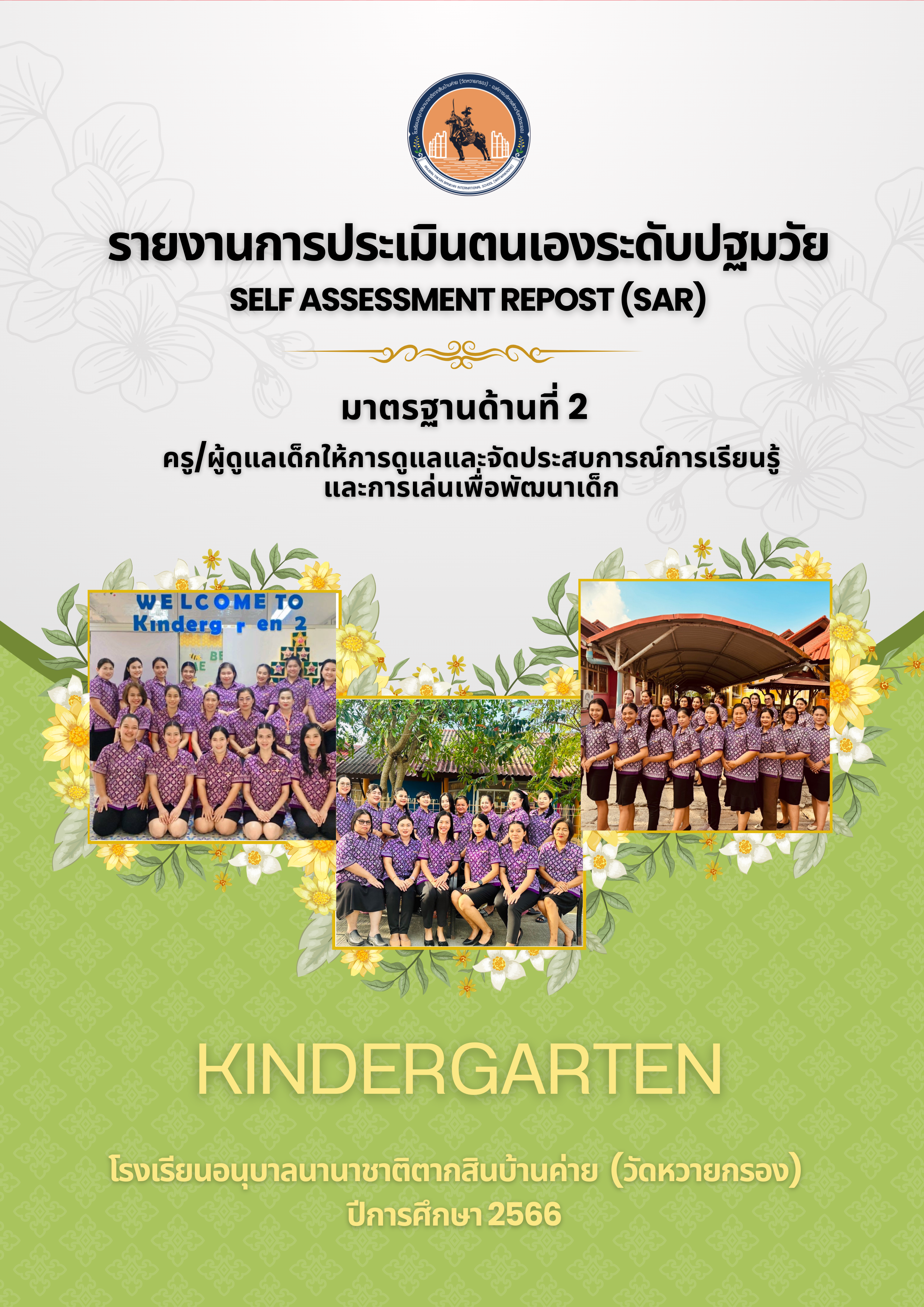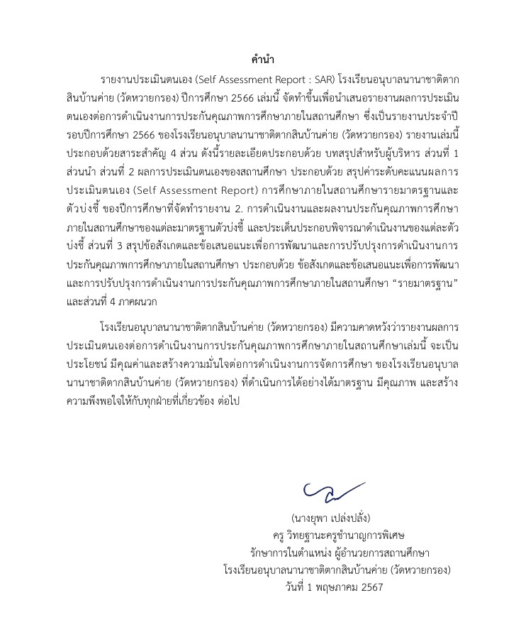 รายงานประเมินตนเอง (Self Assessment Report : SAR) โรงเรียนอนุบาลนานาชาติตากสินบ้านค่าย (วัดหวายกรอง) ปีการศึกษา 2566 เล่มนี้ จัดทำขึ้นเพื่อนำเสนอรายงานผลการประเมินตนเองต่อการดำเนินงานการประกันคุณภาพการศึกษาภายในสถานศึกษา ซึ่งเป็นรายงานประจำปี รอบปีการศึกษา 2566 ของโรงเรียนอนุบาลนานาชาติตากสินบ้านค่าย (วัดหวายกรอง) รายงานเล่มนี้ประกอบด้วยสาระสำคัญ 4 ส่วน ดังนี้รายละเอียดประกอบด้วย บทสรุปสำหรับผู้บริหาร ส่วนที่ 1 ส่วนนำ ส่วนที่ 2 ผลการประเมินตนเองของสถานศึกษา ประกอบด้วย สรุปค่าระดับคะแนนผลการประเมินตนเอง (Self Assessment Report) การศึกษาภายในสถานศึกษารายมาตรฐานและตัวบ่งชี้ ของปีการศึกษาที่จัดทำรายงาน 2. การดำเนินงานและผลงานประกันคุณภาพการศึกษาภายในสถานศึกษาของแต่ละมาตรฐานตัวบ่งชี้ และประเด็นประกอบพิจารณาดำเนินงานของแต่ละตัวบ่งชี้ ส่วนที่ 3 สรุปข้อสังเกตและข้อเสนอแนะเพื่อการพัฒนาและการปรับปรุงการดำเนินงานการประกันคุณภาพการศึกษาภายในสถานศึกษา ประกอบด้วย ข้อสังเกตและข้อเสนอแนะเพื่อการพัฒนาและการปรับปรุงการดำเนินงานการประกันคุณภาพการศึกษาภายในสถานศึกษา “รายมาตรฐาน” และส่วนที่ 4 ภาคผนวก