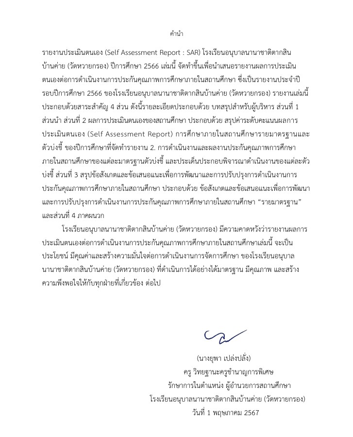 บ้านค่าย (วัดหวายกรอง) ปีการศึกษา 2566 เล่มนี้ จัดทำขึ้นเพื่อนำเสนอรายงานผลการประเมินตนเองต่อการดำเนินงานการประกันคุณภาพการศึกษาภายในสถานศึกษา ซึ่งเป็นรายงานประจำปี รอบปีการศึกษา 2566 ของโรงเรียนอนุบาลนานาชาติตากสินบ้านค่าย (วัดหวายกรอง) รายงานเล่มนี้ประกอบด้วยสาระสำคัญ 4 ส่วน ดังนี้รายละเอียดประกอบด้วย บทสรุปสำหรับผู้บริหาร ส่วนที่ 1 ส่วนนำ ส่วนที่ 2 ผลการประเมินตนเองของสถานศึกษา ประกอบด้วย สรุปค่าระดับคะแนนผลการประเมินตนเอง (Self Assessment Report) การศึกษาภายในสถานศึกษารายมาตรฐานและตัวบ่งชี้ ของปีการศึกษาที่จัดทำรายงาน 2. การดำเนินงานและผลงานประกันคุณภาพการศึกษาภายในสถานศึกษาของแต่ละมาตรฐานตัวบ่งชี้ และประเด็นประกอบพิจารณาดำเนินงานของแต่ละตัวบ่งชี้ ส่วนที่ 3 สรุปข้อสังเกตและข้อเสนอแนะเพื่อการพัฒนาและการปรับปรุงการดำเนินงานการประกันคุณภาพการศึกษาภายในสถานศึกษา ประกอบด้วย ข้อสังเกตและข้อเสนอแนะเพื่อการพัฒนาและการปรับปรุงการดำเนินงานการประกันคุณภาพการศึกษาภายในสถานศึกษา “รายมาตรฐาน” และส่วนที่ 4 ภาคผนวก